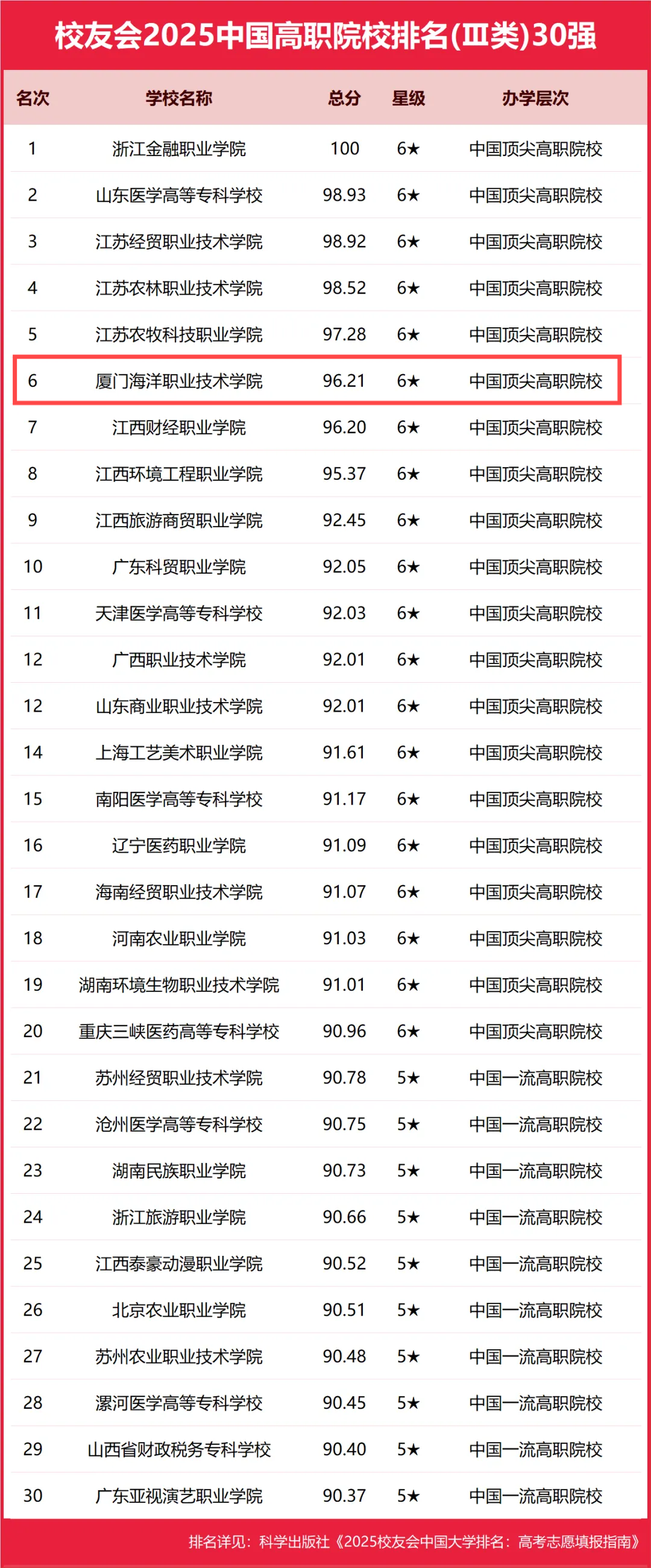 近日,大学评价研究机构艾瑞深校友会网正式发布“校友会2025中国大学排名”,我校以96.21分的总分位列2025全国高职院校(III类)第6位,排名位次连续五年排名福建省第一。我校在2025年的排名位次与2024年相比提升了5位,与2023年相比提升了4位,与2022年相比提升了8位。