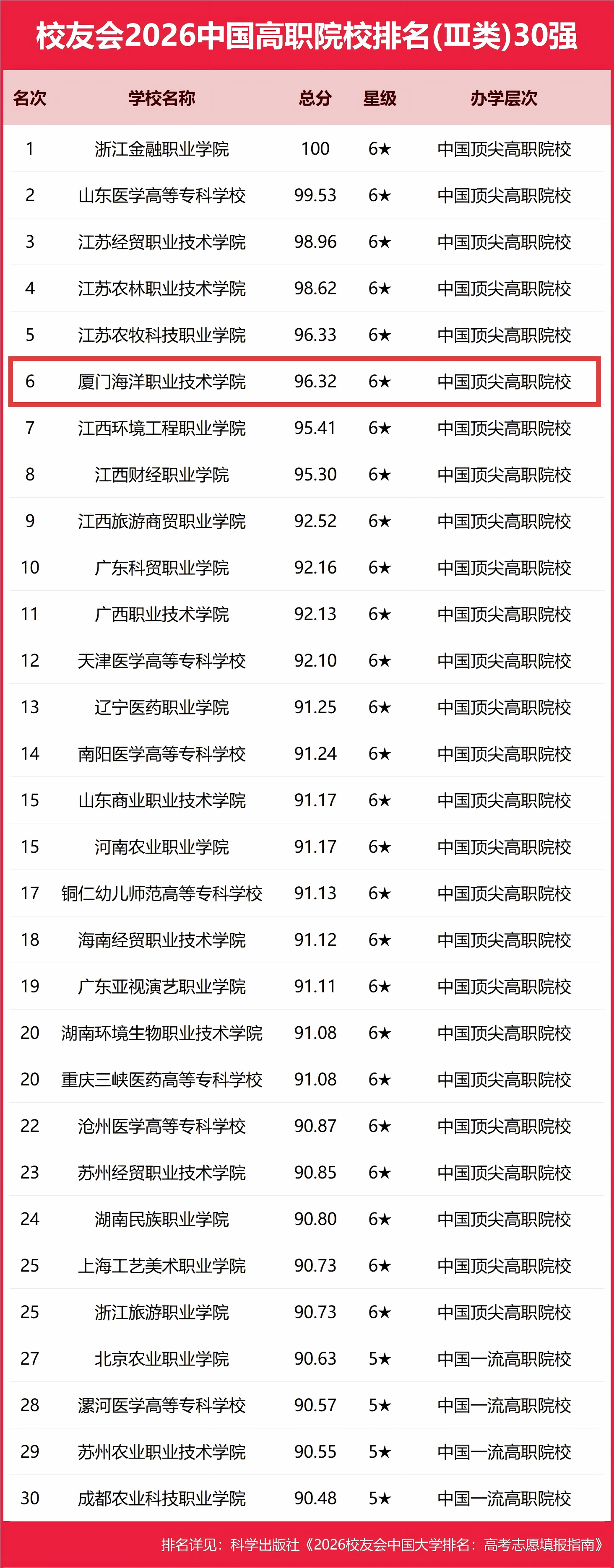 近日,全国第三方大学评价研究机构艾瑞深校友会网(Cuaa.net)正式发布校友会2026中国大学排名,我校以96.32分的总分位列2026全国高职院校(Ⅲ类)第6位,排名位次连续两年跻身“中国顶尖高职院校”全国前六,连续六年位列福建省第一。与此同时,我校还位列校友会2026中国海洋类高职院校排名榜首。