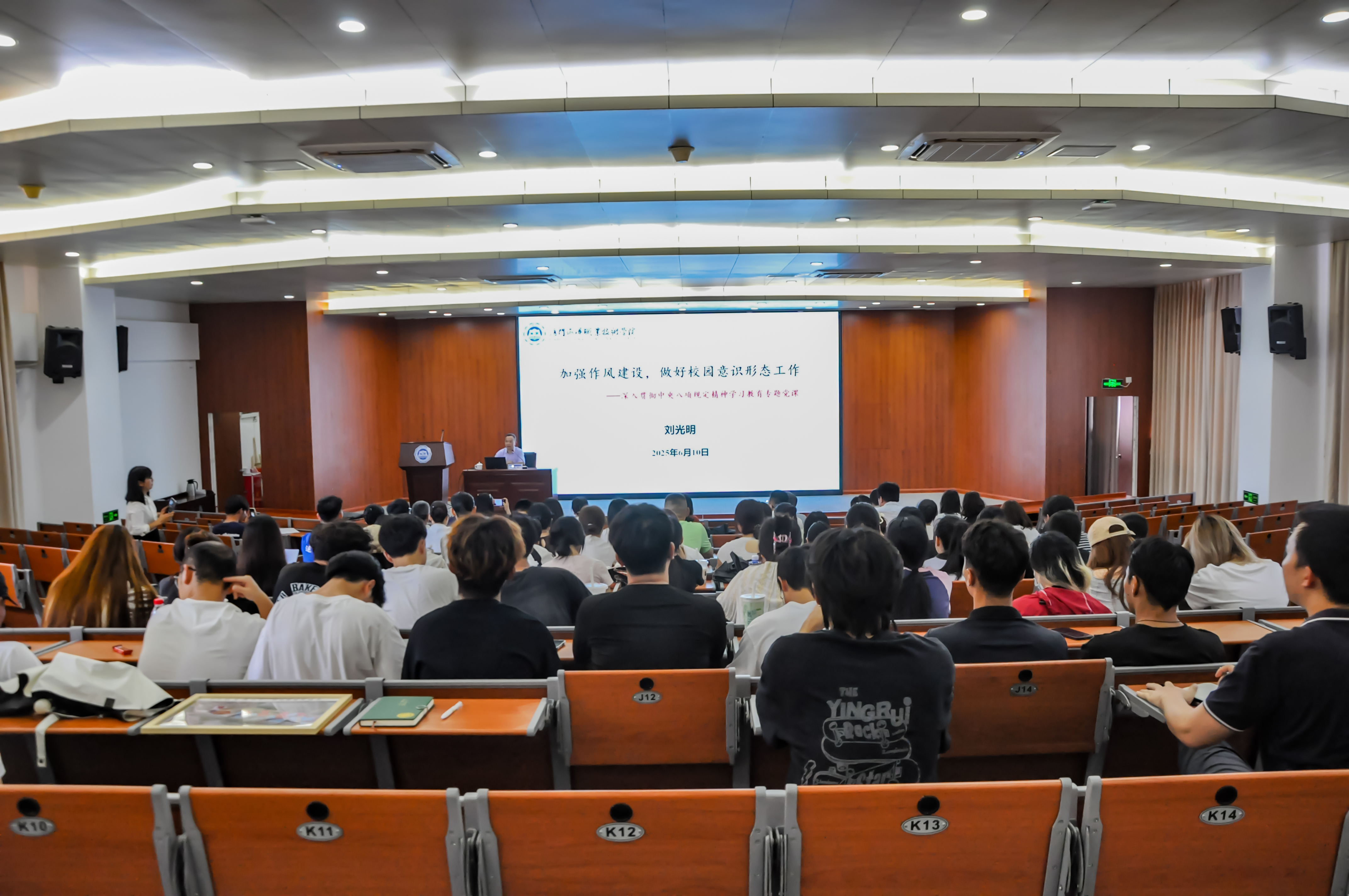 6月10日,党委副书记、院长刘光明在翔安校区T2报告厅以“加强作风建设,做好校园意识形态工作”为题,作深入贯彻中央八项规定精神学习教育专题党课。